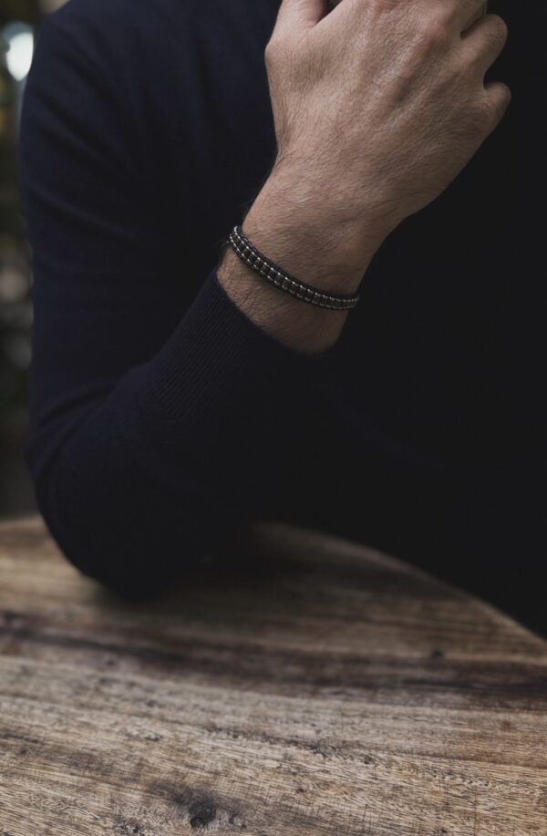 Samuel – Stilrent herrarmband i brun sten och svart läder, inspirerat av naturens färger och moder jords nyanser. Harmonisk kombination av modern design och maskulin elegans. Passar lika bra till vardag som till fest!